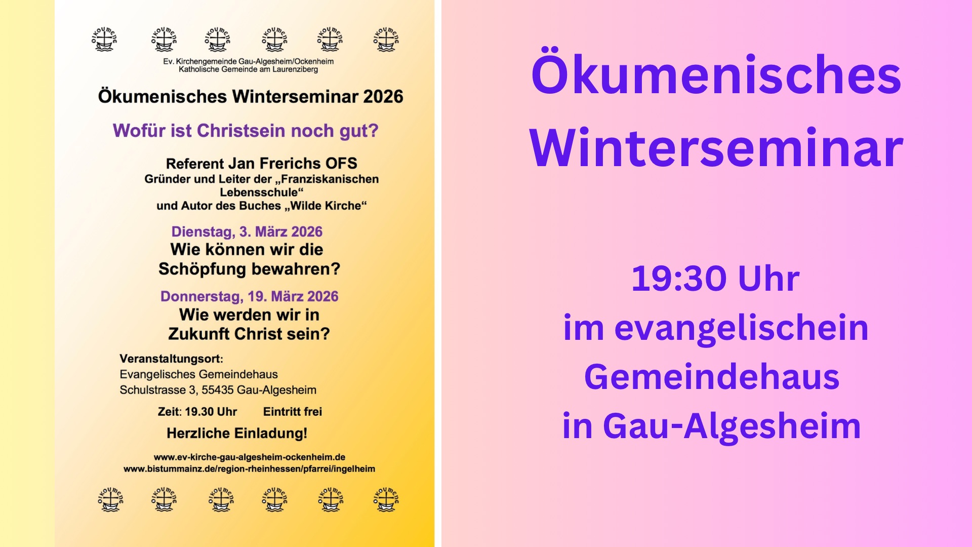 Ökumenisches Winterseminar 2026 Vortrag und Diskussion Wofür ist Christsein noch gut? Referent Jan Frerichs OFS Gründer und Leiter der „Franziskanischen Lebensschule“ und Autor des Buches „Wilde Kirche“ Donnerstag, 19. März 2026 Wie werden wir in Zukunft Christ sein?