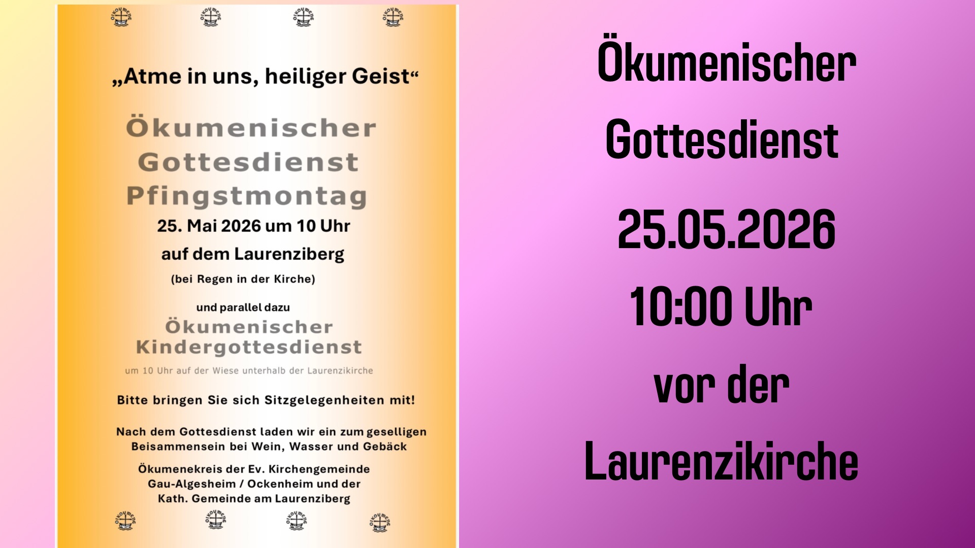 Ökumenischer Gottesdienst Pfingstmontag 25. Mai 2026 um 10 Uhr auf dem Laurenziberg (bei Regen in der Kirche) und parallel dazu Ökumenischer Kindergottesdienst um 10 Uhr auf der Wiese unterhalb der Laurenzikirche Bitte bringen Sie sich Sitzgelegenheiten mit. Nach dem Gottesdienst laden wir ein zum geselligen Beisammensein bei Wein, Wasser und Gebäck