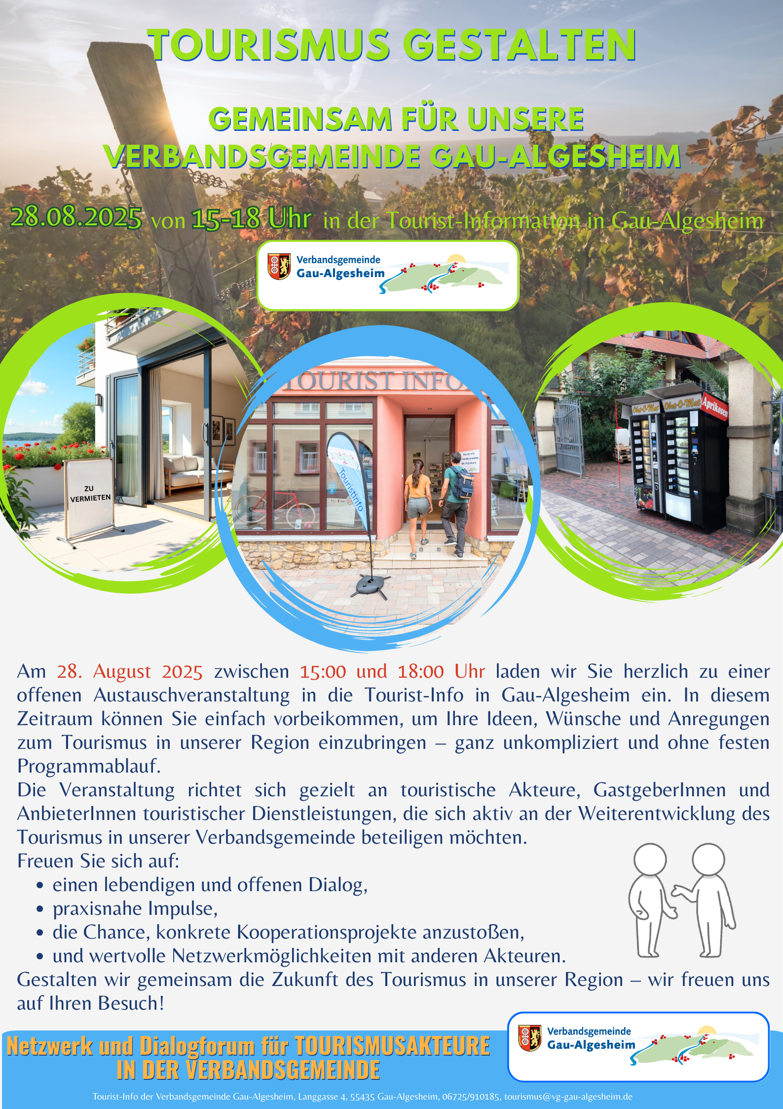 📅 Am Donnerstag, 28. August 2025, findet von 15:00 bis 18:00 Uhr in der Tourist-Information Gau-Algesheim eine offene Austauschveranstaltung statt.