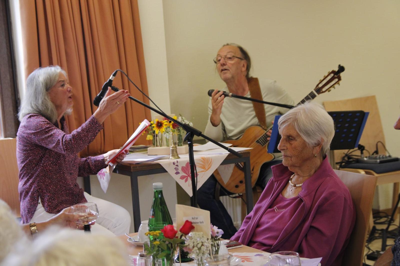 Vor vollbesetztem Saal kam als erstes Emma zu Wort, die sich im Theater bei ihrem Mann Otto über den üblen Geruch beschwerte: „Es riecht genau wie zuhause, es riecht nach deinen Socken!“ In einem weiteren Beitrag wurde die Tat eines Hühnerdiebes vor Gericht verhandelt. Auf jede Frage des Richters antwortete der Angeklagte mit einem Lied: „Wann sind sie geboren – am Rosenmontag…“ Bei der Ehrung der Geburtstagskinder wurde auch das Ehepaar Kerwer besonders erwähnt, dem das seltene Fest der Gnadenhochzeit gewährt wurde. Allen war das Lied „Aber dich gibt’s nur einmal für mich“ gewidmet, gespielt von unserem Gitarristen Heinz-Peter Germeroth, der dieses Mal ohne Renate Fleischer und ihr Akkordeon auskommen musste.