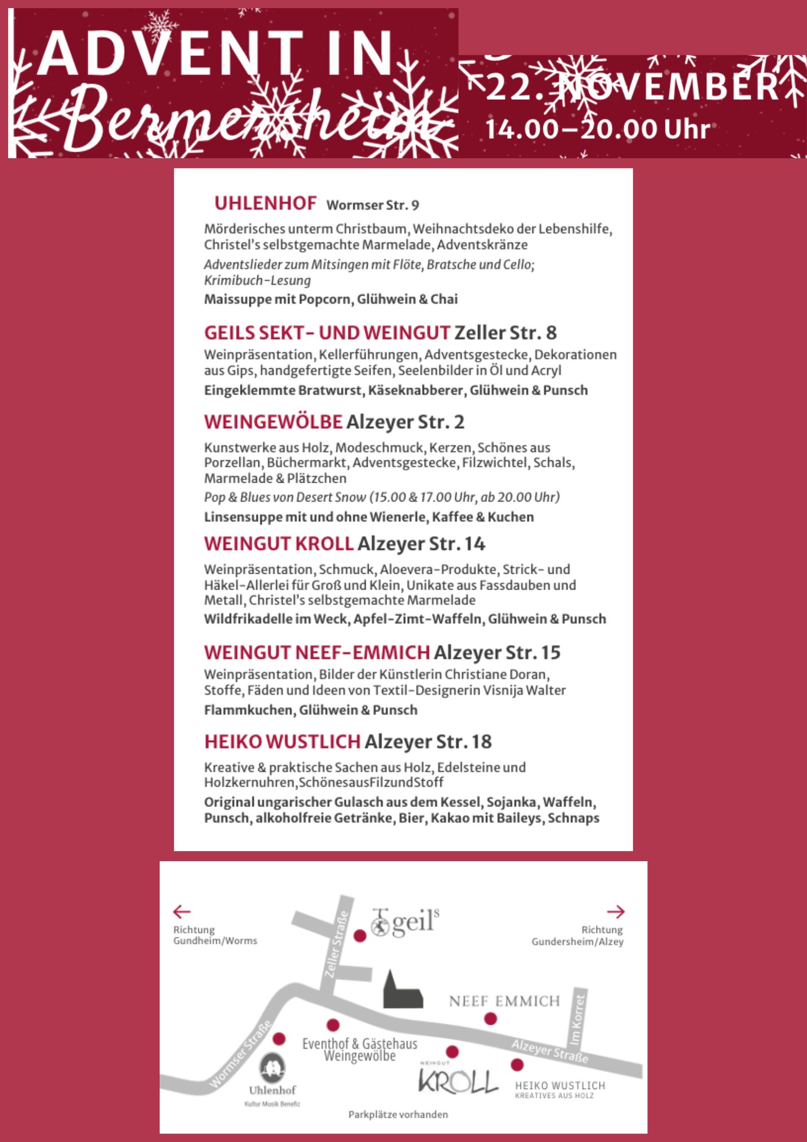 Bermersheim – nur etwa eine halbe Stunde von Ockenheim entfernt, südlich von Alzey. Heute ab 14:00 Uhr gibt’s dort Advent in sechs Höfen. Ich war in letzter Zeit öfter im Austausch mit dem Bürgermeisterkollegen und schaue heute selbst mal vorbei!