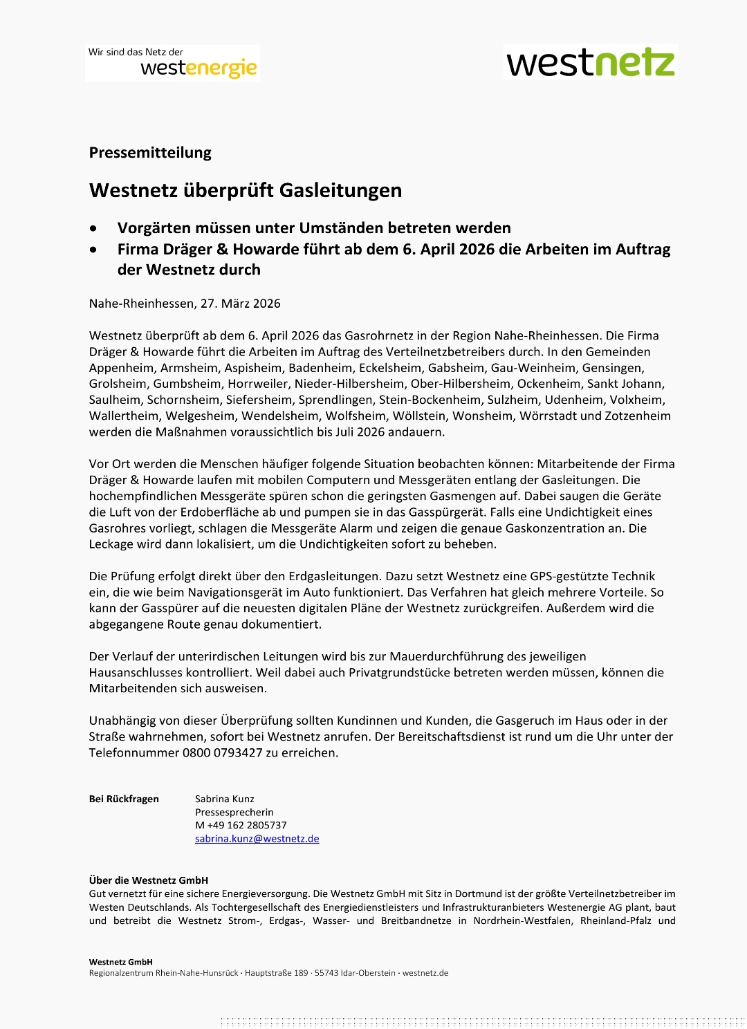 Ab dem 6. April 2026 überprüft Westnetz das Gasrohrnetz in Ockenheim und weiteren Gemeinden in der Region Nahe-Rheinhessen. Die Arbeiten werden im Auftrag von Westnetz durch die Firma Dräger & Howarde durchgeführt und dauern voraussichtlich bis Juli 2026 an.